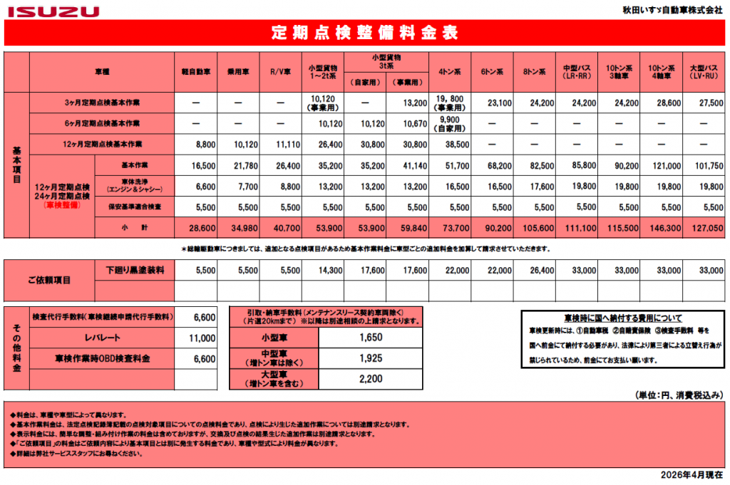 2026年4月現在の定期点検整備料金をお知らせいたします。